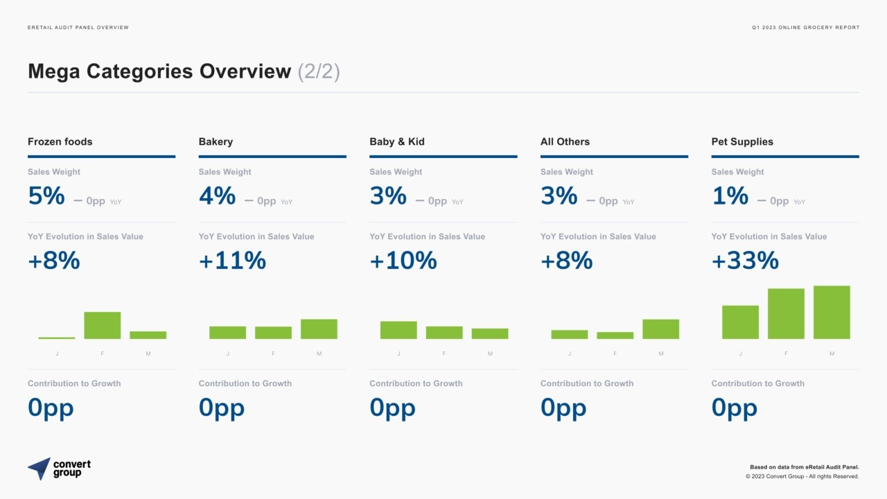 Σε σύγκριση με την αντίστοιχη περίοδο του 2022 οι κατηγορίες που αυξήθηκαν σε αξία (€) online αγορών ήταν: +33% σε προϊόντα για κατοικίδια, +19% σε χαρτικά και είδη καθαρισμού, +13% σε ποτά και αναψυκτικά, +11% σε είδη αρτοποιίας, +10% σε βρεφικά είδη, +8% σε φρέσκα τρόφιμα, +8% σε κατεψυγμένα τρόφιμα, +6% σε προϊόντα περιποίησης και ομορφιάς, ενώ τα λοιπά είδη αυξήθηκαν σε αξία (€) online αγορών κατά 8% .