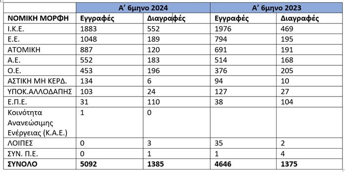 Η επιχειρηματικότητα στην Ελλάδα παρουσιάζει θετικές τάσεις με τις επιχειρήσεις, που ξεκίνησαν τη δραστηριότητά τους το πρώτο εξάμηνο του 2024, να είναι σχεδόν τετραπλάσιες από τον αριθμό των επιχειρήσεων που διαγράφηκαν.