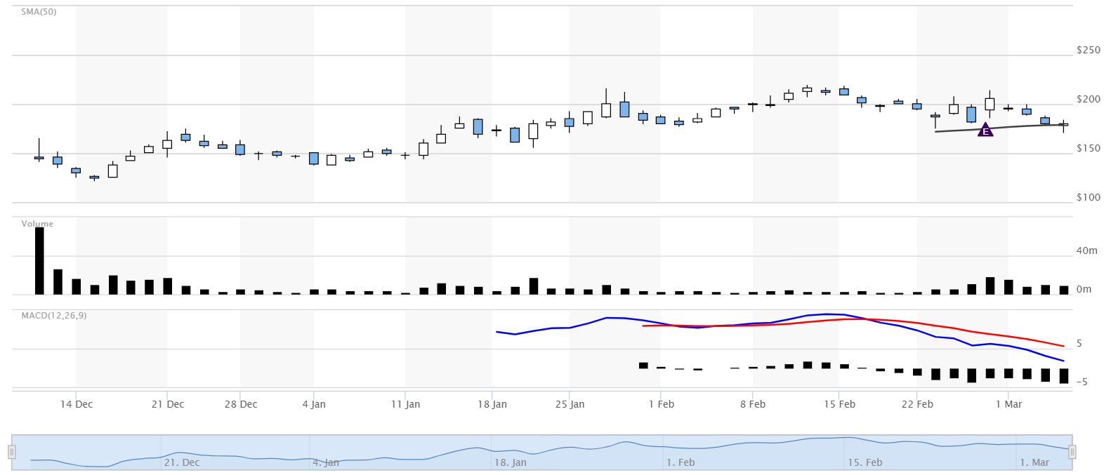 Χθες Πέμπτη, η μετοχή ήταν υπό διαπραγμάτευση στα 177.90 δολάρια ανά μετοχή, σημειώνοντας άνοδο κατά 22,77 σε ετήσια βάση, υπερδιπλάσια των 68 δολαρίων ανά μετοχή που είχε τιμολογήσει την αρχική δημόσια προσφορά της.
