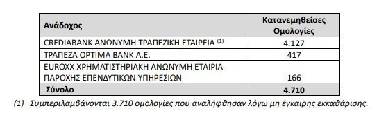 Επίσης, από τις 65.000 Ομολογίες που κατανεμήθηκαν σε Ειδικούς Επενδυτές, οι Ανάδοχοι έλαβαν για δικό τους λογαριασμό 4.710 Ομολογίες ως ακολούθως: