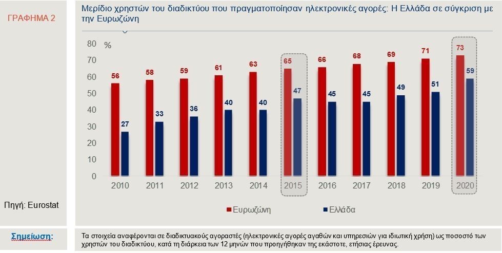 Αξίζει να σημειωθεί ότι, το 2015 και το 2020, οι ηλεκτρονικές αγορές στη χώρα μας σημείωσαν μεγαλύτερη άνοδο, σε σχέση με άλλες χρονικές περιόδους, καθώς δύο διαφορετικές διαταραχές είχαν σχεδόν παρόμοιο αντίκτυπο στο εγχώριο λιανικό εμπόριο και ιδιαίτερα στο ηλεκτρονικό. Το 2015, η επιβολή περιορισμών στην ανάληψη μετρητών και στην κίνηση κεφαλαίων εντός της χώρας είχε σαν αποτέλεσμα την απότομη αύξηση των ηλεκτρονικών αγορών, μεταξύ των χρηστών του διαδικτύου. Η τάση αυτή ανακόπηκε ελαφρώς, τη διετία 2016-2017. Αντίστοιχα, το 2020, οι περιορισμοί της φυσικής παρουσίας στα καταστήματα λιανικού εμπορίου, λόγω της πανδημίας, οδήγησαν σε νέο, απότομο άλμα του ηλεκτρονικού εμπορίου μεταξύ των χρηστών του διαδικτύου, εξέλιξη που αναμένεται να συνεχιστεί με μεγαλύτερη ένταση και τα επόμενα έτη, λόγω της αναβάθμισης των ψηφιακών μέσων παγκοσμίως.