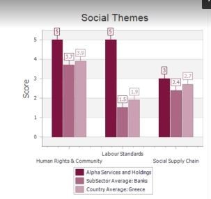 Υψηλές ήταν οι επιδόσεις της Alpha Services and Holdings στα θέματα που αφορούν στην Κοινωνία, με την FTSE Russel να την αξιολογεί με την καλύτερη βαθμολογία για τις επιδόσεις της σε θέματα Ανθρωπίνων Δικαιωμάτων και Κοινότητας (Human Rights & Community) και Εργασιακών Κριτηρίων (Labour Standards), ενώ υψηλότερες του μέσου όρου, τόσο των ελληνικών όσο και των ξένων τραπεζών είναι και οι επιδόσεις της σε θέματα Εφοδιαστικής Αλυσίδας για Κοινωνικές Δράσεις.