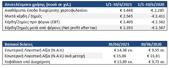 Για την περίοδο από 01/01/2021 έως 30/06/2021 το χαρτοφυλάκιο της Εταιρίας σημείωσε άνοδο 18,82% με την εσωτερική αξία του χαρτοφυλακίου (Ν.Α.V.) να ανέρχεται σε €14,38 εκατ. ή €35,86 ανά μετοχή στις 30/06/2021.