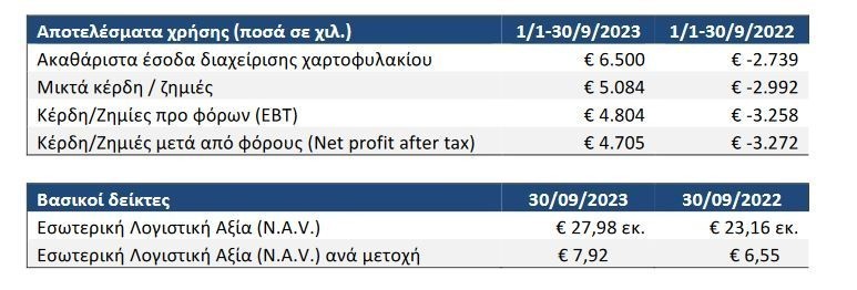 Για την περίοδο από 01/01/2023 έως 30/09/2023 το χαρτοφυλάκιο της Εταιρίας σημείωσε άνοδο 19,20% με την εσωτερική αξία του χαρτοφυλακίου (Ν.Α.V.) να ανέρχεται σε €27,98 εκατ. ή € 7,92 ανά μετοχή στις 30/09/2023.