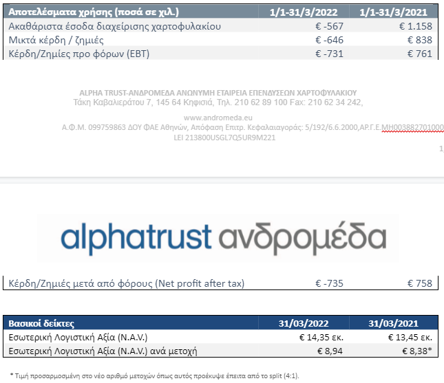Ζημιές €735,60 χιλ., έναντι κερδών €758,26 χιλ. το αντίστοιχο τρίμηνο του 2021, βάσει των Διεθνών Προτύπων Χρηματοοικονομικής Αναφοράς (Δ.Π.Χ.Α.) εμφάνισε το α΄ τρίμηνο του 2022 η ALPHA TRUST-ΑΝΔΡΟΜΕΔΑ Α.Ε.Ε.Χ.