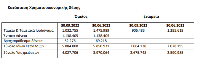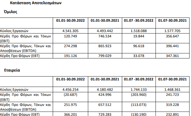 Ειδικότερα όπως αναφέρει η ανακοίνωση, «τα αποτελέσματα προ φόρων, χρηματοδοτικών και επενδυτικών αποτελεσμάτων διαμορφώθηκαν σε 120,74 χιλ. ευρώ (19,84 χιλ. ευρώ αφορούν το γ΄ τρίμηνο του 2022), έναντι 746,53 χιλ. ευρώ την αντίστοιχη περίοδο του 2021 (356,64 χιλ. αφορούν στο γ’ τρίμηνο του 2021), σημειώνοντας μείωση 83,8%.