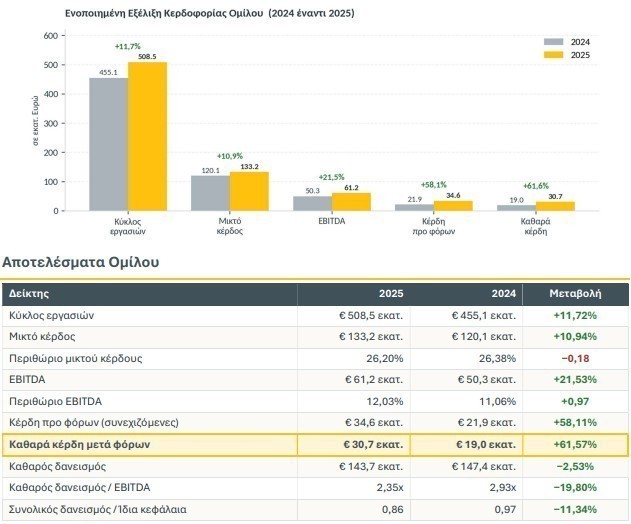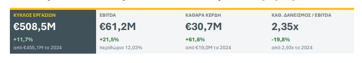Τα κέρδη προ φόρων από συνεχιζόμενες δραστηριότητες αυξήθηκαν σε Ευρώ 34,6 εκατ., έναντι Ευρώ 21,9 εκατ. το 2024, ενώ τα συνολικά καθαρά κέρδη μετά φόρων διαμορφώθηκαν σε Ευρώ 30,7 εκατ., έναντι Ευρώ 19,0 εκατ., καταγράφοντας αύξηση 61,57%.