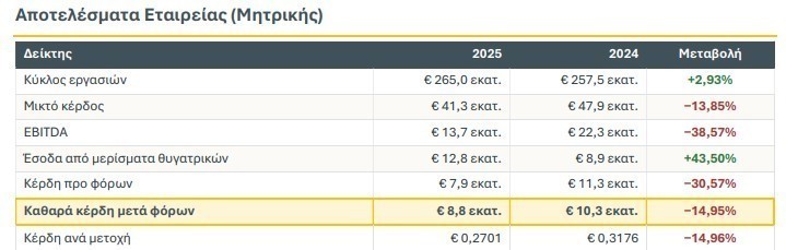 Ο αντίκτυπος αυτός δεν είναι συγκυριακός, αλλά αντανακλά την ανθεκτικότητα και τη διάχυση της ενοποιημένης κερδοφορίας στη μητρική δομή, μέσω των μερισματικών αποφάσεων που έλαβαν οι θυγατρικές. Σημειώνεται ότι, στο επίπεδο του Ομίλου, τα έσοδα αυτά απαλείφονται κατά την ενοποίηση και, ως εκ τούτου, δεν υπερεκτιμούν την ενοποιημένη κερδοφορία. Αντιθέτως, τα ενοποιημένα μεγέθη αποτυπώνουν αυστηρά τη λειτουργική επίδοση των εταιρειών του Ομίλου έναντι τρίτων. Ως αποτέλεσμα, τα καθαρά κέρδη της Μητρικής διαμορφώθηκαν σε Ευρώ 8,8 εκατ., μειωμένα οριακά κατά 14,95%, πτώση πολύ περιορισμένη συγκριτικά με την ένταση της προσωρινής λειτουργικής επίπτωσης.