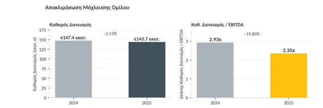 Οι λειτουργικές ταμειακές ροές του Ομίλου παρέμειναν έντονα θετικές, διαμορφούμενες σε Ευρώ 26,6 εκατ. έναντι Ευρώ 23,0 εκατ. το 2024, υποστηρίζοντας αυτοδύναμα το επενδυτικό πρόγραμμα.