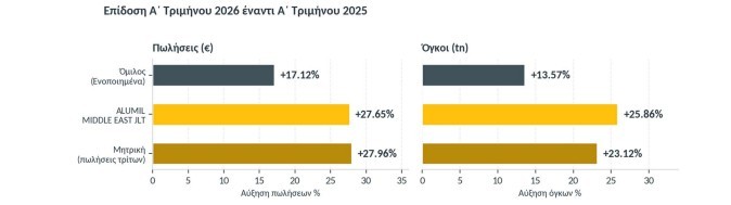 Η δυναμική του 2025 μεταφέρεται ενισχυμένη στο 2026. Τα στοιχεία του πρώτου τριμήνου 2026 καταγράφουν σε ενοποιημένο επίπεδο πωλήσεις σε αξίες Ευρώ 132,3 εκατ. έναντι Ευρώ 112,9 εκατ. του αντίστοιχου τριμήνου 2025 (αύξηση 17,12%) και σε ποσότητες 16,8 χιλ. τόνους από 14,8 χιλ. τόνων (αύξηση 13,57%).