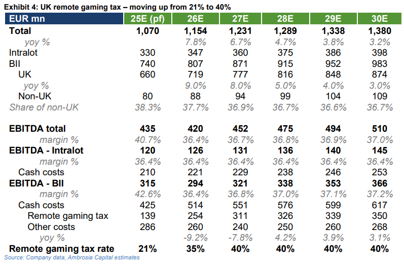 Η πολυαναμενόμενη αύξηση του φόρου στο remote gaming του Ηνωμένου Βασιλείου ανακοινώθηκε, με την βρετανική κυβέρνηση να ανεβάζει τον συντελεστή από 21% σε 40%. Η Ambrosia εκτιμά ότι η αύξηση θα αντισταθμιστεί κυρίως μέσω περικοπών του κόστους. Το υψηλό περιθώριο EBITDA της Bally’s, περίπου 40%, επιτρέπει στην εταιρεία να απορροφήσει μεγάλο μέρος του πρόσθετου φορολογικού βάρους και να αυξήσει το μερίδιο αγοράς, καθώς οι μικρότεροι και λιγότερο κερδοφόροι πάροχοι θα πιεστούν.