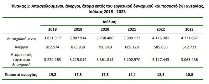 Οι άνεργοι διαμορφώθηκαν σε 512.721 άτομα σημειώνοντας μείωση κατά 72.935 άτομα σε σχέση με τον Ιούλιο του 2022 (-12,5%) και κατά 9.938 άτομα σε σχέση με τον Ιούνιο του 2023 (-1,9%).