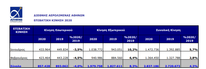 Οσον αφορά τα συγκεντρωτικά στοιχεία κατά τους πρώτους δύο μήνες του έτους, η κίνηση του αεροδρομίου έφθασε τα 2,8 εκατ. επιβάτες, σημειώνοντας άνοδο της τάξης του 4,3%. Οι επιβάτες εξωτερικού σημείωσαν άνοδο κατά 8,3%, ενώ οι επιβάτες εσωτερικού παρουσίασαν πτώση 4%. Ο αριθμός των πτήσεων στο Διεθνή Αερολιμένα Αθηνών για το πρώτο δίμηνο του 2020 ανήλθε σε 26.322, καταγράφοντας άνοδο της τάξης του 1,8%. Οι διεθνείς πτήσεις παρουσίασαν άνοδο σε σχέση με το 2019 (+7,4%), ενώ οι εγχώριες σημείωσαν πτώση (-5,7%).