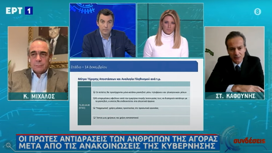 «Σεβόμαστε αποδεδειγμένα τη γνώμη των ειδικών επιστημόνων για τα θέματα υγείας, όμως δεν μπορούμε να τους αφήσουμε να τοποθετούνται και σε πρακτικά ζητήματα της αγοράς, που γνωρίζουμε καλύτερα και αφορούν χιλιάδες συμπολίτες μας. Η κατάσταση που έχουμε μπροστά μας είναι κρίσιμη και πρέπει να βρούμε πειστικές απαντήσεις για τους συναδέλφους μας, που έχουν ένα συνοικιακό κατάστημα που το επισκέπτονται 4-5 άνθρωποι την ημέρα», είπε ο κ. Καφούνης.