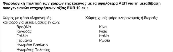 Το Global Family Business Tax Monitor περιγράφει τις διαφορετικές φορολογικές μεταχειρίσεις σε 54 χώρες στο θέμα της ενδοοικογενειακής μεταβίβασης μιας οικογενειακής επιχείρησης που εκτιμάται στα EUR 10 εκ.. Μεταξύ των 54 χωρών της έρευνας, στις 14 εφαρμόζεται συγκεκριμένος φόρος κληρονομιάς (οι ΗΠΑ επιβάλλουν φόρο περιουσίας για κληρονομιά οικογενειακής επιχείρησης), ενώ σε 16 υπάρχει φόρος δωρεάς που ισχύει για περιπτώσεις μεταβίβασης της επιχείρησης εν ζωή. Στις 10 χώρες με τα υψηλότερα ΑΕΠ της έρευνας, οι έξι (Βραζιλία, Καναδάς, Γαλλία, Γερμανία, ΗΠΑ, Ηνωμένο Βασίλειο) έχουν φόρους που ισχύουν για τις μεταβιβάσεις τόσο λόγω κληρονομιάς, όσο και εν ζωή, ενώ τέσσερις (Κίνα, Ινδία, Ιταλία και Ρωσία), δεν έχουν φόρους ούτε για δωρεά ούτε για κληρονομιά σε περιπτώσεις μεταβίβασης οικογενειακής επιχείρησης. Άλλοι φόροι, όπως ο φόρος υπεραξίας και ο φόρος προσωπικού εισοδήματος, ισχύουν επίσης σε κάποιες δικαιοδοσίες.