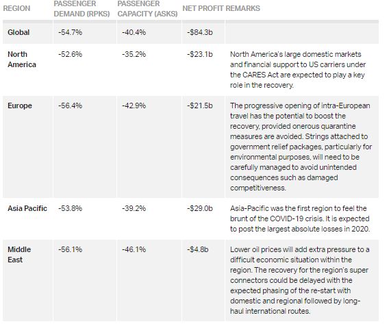 «Νομίζουμε ότι οι αεροπορικές πιθανότατα θα χάσουν ένα ποσό άνευ προηγουμένου, ύψους 84 δισ. δολ. το 2020», ανέφερε ο Μπράιαν Πίαρς, επικεφαλής οικονομολόγος της ΙΑΤΑ, μιλώντας στο CNBC. «Αυτό που βλέπουμε στην πραγματικότητα είναι ότι οι χώρες διαπραγματεύονται διμερή ανοίγματα των αγορών τους, όπως πχ. οι περιπτώσεις Αυστραλίας – νέας Ζηλανδίας, Κίνας – Σιγκαπούρης, Κίνας και Κορέας». Ωστόσο, ο Πίαρς ανέφερε πως συνεχίζει να περιμένει ανάκαμψη στο β’ εξάμηνο του 2020.