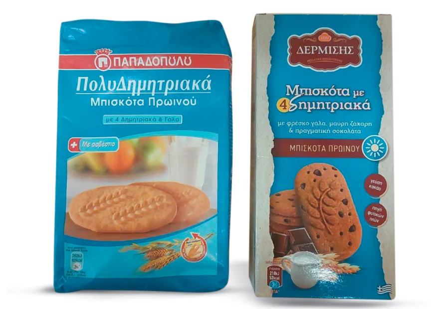 - Μπισκότα με 4 Δημητριακά, με Φρέσκο Γάλα, Μαύρη Ζάχαρη & Πραγματική Σοκολάτα – Μπισκότα Πρωινού, σε μπλε συσκευασία, και
