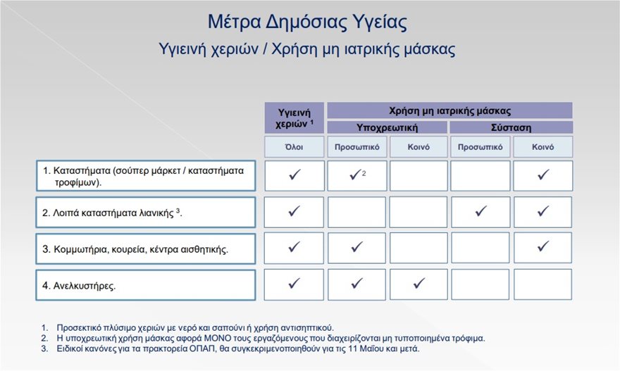 Επίσης δεν είναι υποχρεωτική και η χρήση γαντιών από υπαλλήλους και καταναλωτές. Αντίθετα υποχρεωτική είναι η υγιεινή χεριών είτε με προσεκτικό πλύσιμο χεριών με νερό και σαπούνι είτε με χρήση αντισηπτικού.