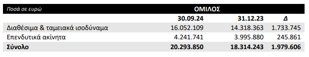 Η χρηματοοικονομική θέση του Ομίλου παραμένει ισχυρή. Τα Ταμιακά Διαθέσιμα, οι επενδύσεις σε εύλογη αξία καθώς και η αξία των επενδυτικών ακινήτων παρουσίασαν σημαντική αύξηση σε σχέση με την 31.12.23.