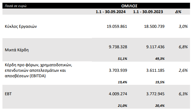 Η σταθερή προσήλωση στην αύξηση των περιθωρίων κέρδους αντικατοπτρίζεται στη βελτίωση των EBITDA και EBT. Το EBITDA ανήλθε σε €3,703 εκατ. ευρώ, σημειώνοντας αύξηση 2,6% Αντίστοιχα, το ΕΒΤ ανήλθε σε €4,009 εκατ. Ευρώ έναντι € 3,773, σημειώνοντας αύξηση 6,3%.