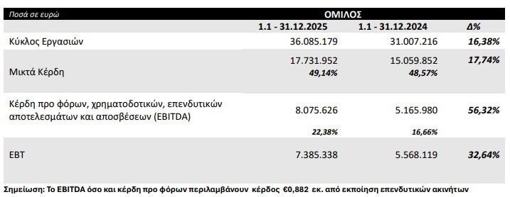 Ο κύκλος εργασιών του Ομίλου ανήλθε σε €36,1 εκατ., αυξημένος κατά 16,38% σε σύγκριση με το 2024.
