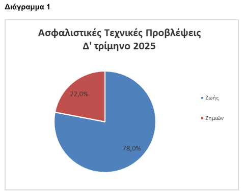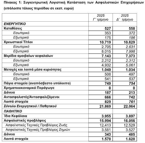 Από την πλευρά του παθητικού, τα ίδια κεφάλαια μειώθηκαν στα 3.897 εκατ. ευρώ στο τέλος του δ΄ τριμήνου του 2025, έναντι 3.955 εκατ. ευρώ το προηγούμενο τρίμηνο. Οι ασφαλιστικές τεχνικές προβλέψεις αυξήθηκαν κατά 62 εκατ. ευρώ και διαμορφώθηκαν στα 16.056 εκατ. ευρώ. Αναλυτικότερα, οι ασφαλιστικές τεχνικές προβλέψεις ζωής αυξήθηκαν κατά 116 εκατ. ευρώ και διαμορφώθηκαν στα 12.529 εκατ. ευρώ, ενώ οι τεχνικές προβλέψεις ζημιών μειώθηκαν κατά 54 εκατ. ευρώ και διαμορφώθηκαν στα 3.527 εκατ. ευρώ. Από το σύνολο των τεχνικών προβλέψεων, το 78,0% αντιστοιχεί σε τεχνικές προβλέψεις ζωής.
