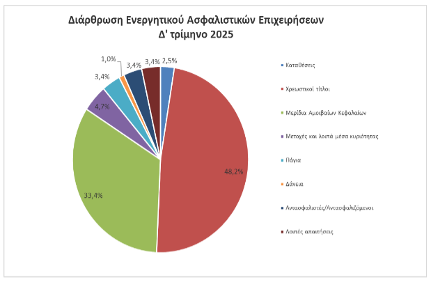 Η αξία των συνολικών τοποθετήσεων των ασφαλιστικών επιχειρήσεων σε χρεωστικούς τίτλους μειώθηκε στα 10.629 εκατ. ευρώ στο τέλος του δ΄ τριμήνου του 2025, έναντι 10.719 εκατ. ευρώ το προηγούμενο τρίμηνο, εξέλιξη που οφείλεται κυρίως σε καθαρές πωλήσεις ομολόγων του εσωτερικού, αλλά και σε μειώσεις στις τιμές των ομολόγων εξωτερικού, παρά τις νέες καθαρές τοποθετήσεις που σημειώθηκαν σε τίτλους εξωτερικού. Το ποσοστό των χρεωστικών τίτλων επί του συνολικού ενεργητικού διαμορφώθηκε σε 48,2% το δ΄ τρίμηνο του 2025, έναντι 49,0% το προηγούμενο τρίμηνο.