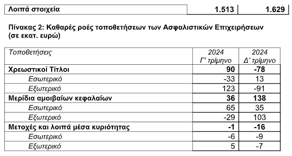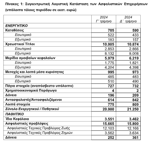 Από την πλευρά του παθητικού, τα ίδια κεφάλαια μειώθηκαν στα 3.462 εκατ. ευρώ στο τέλος του δ΄ τριμήνου του 2024, έναντι 3.551 εκατ. ευρώ το προηγούμενο τρίμηνο. Οι ασφαλιστικές τεχνικές προβλέψεις αυξήθηκαν κατά 135 εκατ. ευρώ και διαμορφώθηκαν στα 15.800 εκατ. ευρώ. Αναλυτικότερα, οι ασφαλιστικές τεχνικές προβλέψεις ζωής αυξήθηκαν κατά 63 εκατ. ευρώ και διαμορφώθηκαν στα 12.166 εκατ. ευρώ, ενώ οι τεχνικές προβλέψεις ζημιών αυξήθηκαν κατά 72 εκατ. ευρώ και διαμορφώθηκαν στα 3.634 εκατ. ευρώ. Από το σύνολο των τεχνικών προβλέψεων, το 77,0% αντιστοιχεί σε τεχνικές προβλέψεις ζωής.