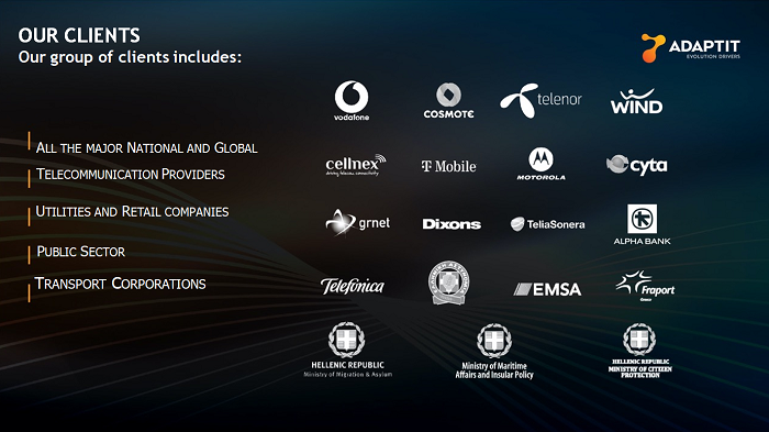 Η διεύρυνση του πελατολογίου και η επέκταση των συνεργασιών της ADAPTIT θεωρείται ένα από τα βασικά χαρακτηριστικά της πορείας της. Στο πελατολόγιο της ανήκουν οργανισμοί όπως η BUYIN, η κοινή εταιρεία των Deutsche Telekom & Orange Group για την προμήθεια τηλεπικοινωνιακού εξοπλισμού βελτιστοποίησης ραδιοκάλυψης 4G/5G, η Κυπριακή Δημοκρατία, το υπουργείο Προστασίας του Πολίτη και η Ιερά Αρχιεπισκοπή Αθηνών, οι τηλεπικοινωνακοί πάροχοι, η Fraport κ.ά.