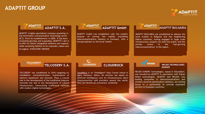 «Υπάρχει ένα μότο το οποίο λέμε, ότι υλοποιούμε έργα ’’με το κλειδί στο χέρι’’. Η ADAPTIT έχει στο DNA της, από εκεί που ξεκίνησε, την παροχή λύσεων, υπηρεσιών και συστημάτων στους τηλεπικοινωνιακούς παρόχους. Αυτός είναι ο πυρήνας», ανέφερε ο κ. Τζαφέρης, ενώ έκανε έναν απολογισμό των πεπραγμένων της ADAPTIT, ανέλυσε τα νέα της σχέδια και δεν απέκλεισε κάποια εξαγορά άλλης εταιρείας.