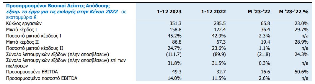 Το προσαρμοσμένο EBITDA του Ομίλου για το 2023 αυξήθηκε κατά 27,2% και ανήλθε σε €49,3 εκατ. με περιθώριο 14,0% έναντι 12,5% το 2022. Εξαιρουμένης της Κένυας, το προσαρμοσμένο EBITDA αυξήθηκε κατά 50,6%.