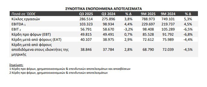 Σε επίπεδο εννεάμηνου, ο κύκλος εργασιών αυξήθηκε κατά 5,3% και ανήλθε σε €789 εκατ.. Το ΕBITDA για το εννεάμηνο του 2025 ανήλθε σε €229,7 εκατ., παρουσιάζοντας αύξηση 4,5%, ενώ τα κέρδη μετά από φόρους (ΕΑΤ) διαμορφώθηκαν σε €72,6 εκατ..