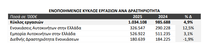 Συνολικά, η δραστηριότητα των βραχυχρόνιων και μακροχρόνιων μισθώσεων στην Ελλάδα, και στις 8 ακόμη χώρες που δραστηριοποιείται ο Όμιλος, απασχολεί στόλο μεγαλύτερο των 65.000 αυτοκινήτων με επενδύσεις (ανανέωσης και επέκτασης) σε περίπου 20.000 νέα αυτοκίνητα εντός του 2025.