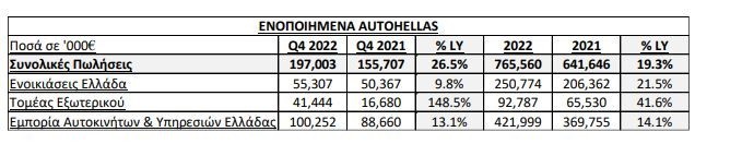 Το τέταρτο τρίμηνο του έτους ο Κύκλος Εργασιών παρουσίασε αύξηση 26,5% και διαμορφώθηκε στα €197,0εκ. έναντι €155,7εκ. το αντίστοιχο τρίμηνο του 2022. Τα Λειτουργικά Κέρδη του τριμήνου (ΕΒΙΤ) ανήλθαν στα €19,1εκ. ενώ τα Κέρδη μετά από φόρους (ΕΑΤ) κατέγραψαν αύξηση 83,0% και διαμορφώθηκαν στα €11,0εκ. Σημειώνεται ότι κατά το τέταρτο τρίμηνο ενσωματώθηκε για πρώτη φορά στα αποτελέσματα του Ομίλου η «HR Aluguer de Automóveis S.A.», franchisee της Hertz International στην Πορτογαλία, προσθέτοντας €18,3εκ. στον Κύκλο Εργασιών αλλά χωρίς ουσιώδη επίδραση στην κερδοφορία αφού η μοναδική δραστηριότητα της εταιρείας, οι βραχυχρόνιες ενοικιάσεις, έχουν και εκεί έντονη εποχικότητα με αρνητικά αποτελέσματα στο τέταρτο και πρώτο τρίμηνο κάθε έτους.