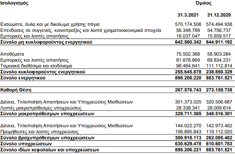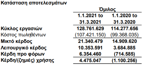 Τα λειτουργικά κέρδη (ΕΒΙΤ) του πρώτου τριμήνου διαμορφώθηκαν σε 10,4 εκατ. ευρώ έναντι 3,7 εκατ. ευρώ το 2020, καταγράφοντας αύξηση 181%. Τα κέρδη μετά από φόρους (ΕΑΤ) του Ομίλου για το πρώτο τρίμηνο 2021 ανήλθαν στα 4,5 εκατ. ευρώ, έναντι ζημιών 1,1 εκατ. ευρώ την αντίστοιχη περσινή περίοδο.