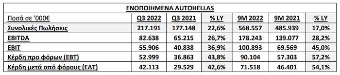 Η Autohellas ανακοινώνει τα αποτελέσματα εννεαμήνου 2022, καταγράφοντας για δεύτερη συνεχή χρονιά νέο ιστορικό υψηλό για τον Όμιλο τόσο σε επίπεδο Κύκλου Εργασιών, όσο και κερδοφορίας. Συγκεκριμένα, το εννεάμηνο του 2022 ο Κύκλος Εργασιών παρουσίασε αύξηση 17% έναντι του εννεάμηνου του 2021, φθάνοντας τα €568,6εκ., από €485,9εκ. το 2021.