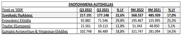 Ο Τομέας μισθώσεων αυτοκινήτων στην Ελλάδα παρουσίασε αύξηση 25,3% του Κύκλου Εργασιών στο εννεάμηνο του 2022, αγγίζοντας τα €195,5 εκ. σε πωλήσεις από €156 εκ. το 2021. Η αύξηση αυτή προέρχεται κυρίως από τις βραχυχρόνιες μισθώσεις, όπου η πορεία της τουριστικής ζήτησης, η περαιτέρω αναβάθμιση του δικτύου των σταθμών, αλλά και η αύξηση μεριδίου αγοράς της Autohellas, έφεραν σημαντικά αποτελέσματα.