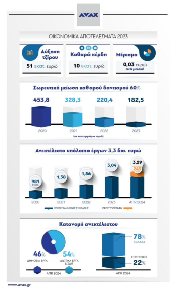 Το 2023 προκύπτει αύξηση 12,6% στον Κύκλο Εργασιών, ο οποίος κινήθηκε στα 453,5εκατ ευρώ, έναντι 402,7 εκατ το 2022. Συνεχίστηκε παράλληλα, για μία ακόμη χρονιά, η εντυπωσιακή μείωση του Καθαρού Δανεισμού της εταιρίας κατά 37,9 εκατ ευρώ το 2023 (-17,2% από το 2022, και -59,8% από το 2020), ενώ σημειώνεται ιστορικό υψηλό στο Ανεκτέλεστο Υπόλοιπο Έργων στα €3,3 δις. Μάλιστα, παρότι η ΑΒΑΞ «τρέχει» το μεγαλύτερο δημόσιο έργο της χώρας, τη Γραμμή 4 του μετρό της Αθήνας, η εταιρία δεν στηρίζεται στα έργα του δημοσίου, αλλά αντιθέτως στο χαρτοφυλάκιο των ανεκτέλεστων έργων τα ιδιωτικά έργα και ΣΔΙΤ αντιπροσωπεύουν το 54% του συνόλου.