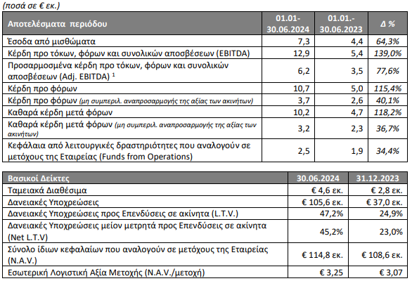 • Η εσωτερική αξία της μετοχής (NAV/share) που αντιστοιχεί στους μετόχους της Εταιρείας ανήλθε σε €3,25 την 30.06.2024 έναντι € 3,07 την 31.12.2023.