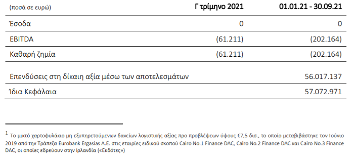Τα βασικά μεγέθη της Εταιρίας για το γ΄ τρίμηνο της χρήσης 2021 και σε σωρευτική βάση από την ίδρυσή της, παρουσιάζονται στον παρακάτω πίνακα: