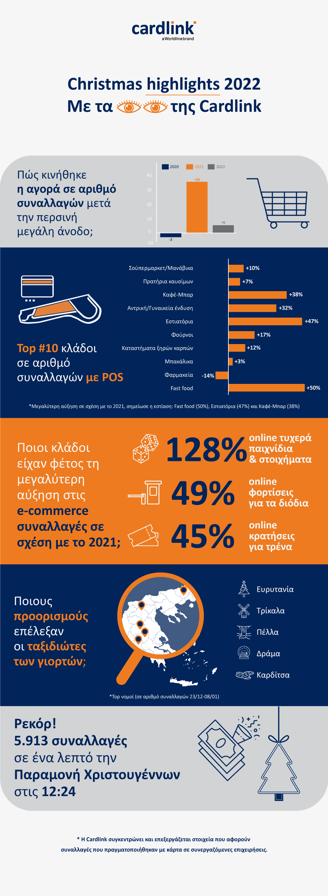 Η Cardlink, μέλος της Worldline, του ηγέτη στην ευρωπαϊκή αγορά πληρωμών και υπηρεσιών διαχείρισης συναλλαγών, συγκεντρώνει και επεξεργάζεται τα δεδομένα* από τις συναλλαγές που πραγματοποιήθηκαν με κάρτα σε συνεργαζόμενες επιχειρήσεις και παρουσιάζει απολογιστικά πώς κινήθηκε η αγορά την περίοδο των εορτών (23/12-08/01).