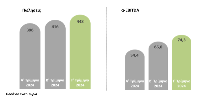 – Οι πωλήσεις ανήλθαν σε 1,26 δισ. ευρώ, 8% υψηλότερα σε σχέση με την αντίστοιχη περσινή περίοδο (9Μ 2023: 1,16 δισ. ευρώ).