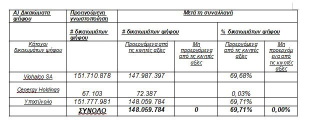 Σε συνέχεια διάθεσης από την Viohalco 3.723.481 υφιστάμενων μετοχών της Cenergy Holdings, η Viohalco κατέχει πλέον το 69,68% του συνολικού μετοχικού κεφαλαίου της Cenergy Holdings (που αντιστοιχεί στο 69,71% των δικαιωμάτων ψήφου λόγω ιδίων μετοχών).