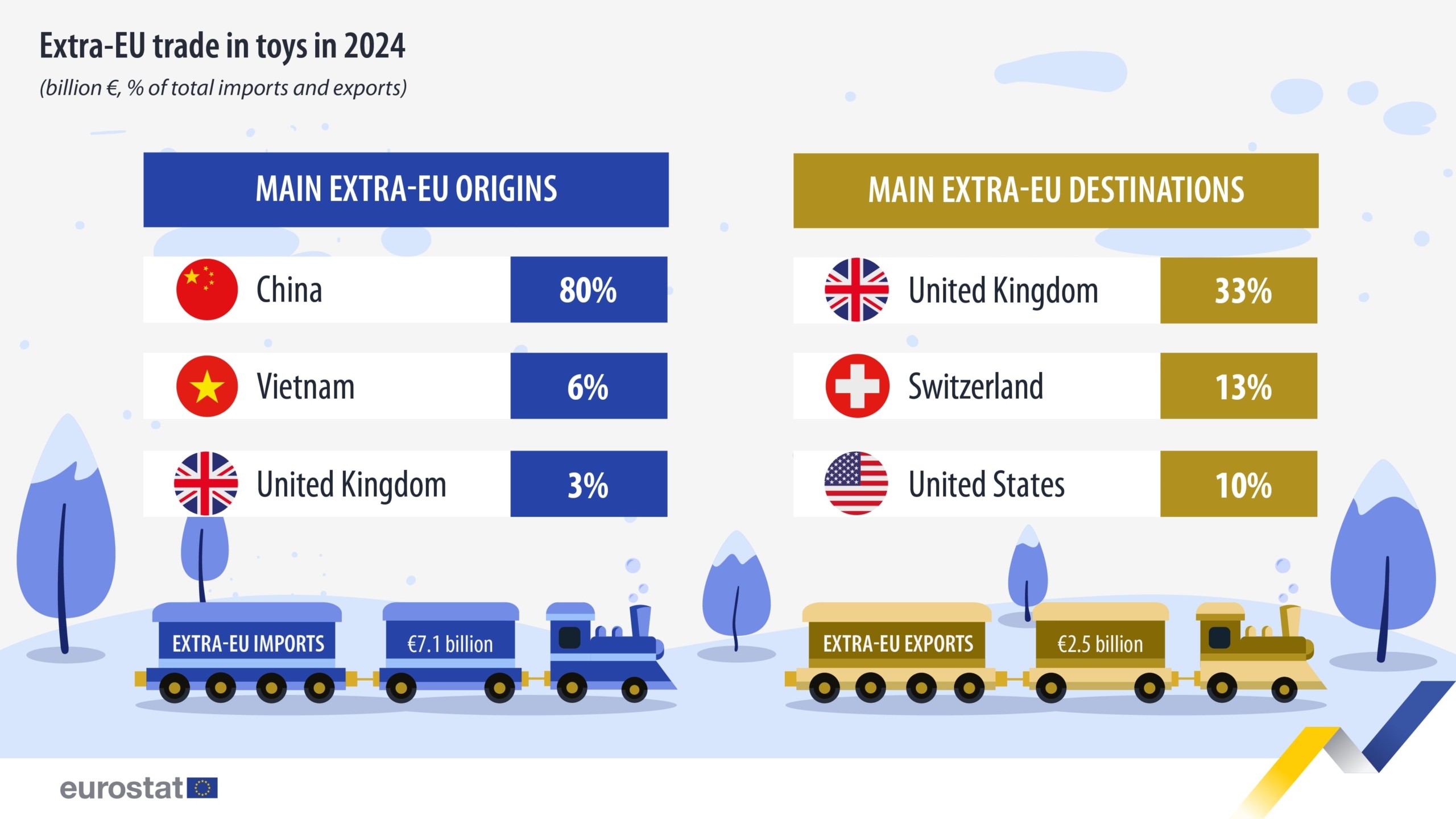 Σε επίπεδο ΕΕ, το Ηνωμένο Βασίλειο ήταν ο κύριος προορισμός εξαγωγών παιχνιδιών (33%), ακολουθούμενο από την Ελβετία (13%) και τις ΗΠΑ (10%), ενώ η Τσεχία, η Γερμανία και το Βέλγιο συγκέντρωσαν σχεδόν το 60% της αξίας των εξαγωγών.