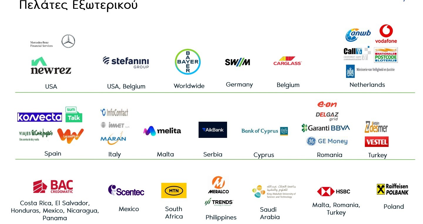Στο χαρτοφυλάκιο των πελατών της στην Ελλάδα ανήκουν τράπεζες, ενεργειακοί όμιλοι, λιανεμπορικοί, «παίκτες» των τηλεπικοινωνιών, επιχειρήσεις από τον χώρο της υγείας, από τον ασφαλιστικό, από τα τυχερά παίγνια, δημόσιοι φορείς, υπουργεία, (για συστήματα εξυπηρέτησης πολιτών από το δημόσιο π.χ. φορολογουμένων), δήμοι κ.ά., και άλλοι ισχυροί οργανισμοί από διάφορους κλάδους στο εξωτερικό (σε ΗΠΑ, Βέλγιο, Γερμανία, Ολλανδία, Ισπανία, Ιταλία, Μάλτα, Σερβία, Κύπρο, Ρουμανία, Πολωνία, Τουρκία, Κόστα Ρίκα, Μεξικό, Ελ Σαλβαδόρ, Παναμά, Νικαράγουα, Ονδούρα, Νότια Αφρική, Φιλιππίνες, Σαουδική Αραβία).
