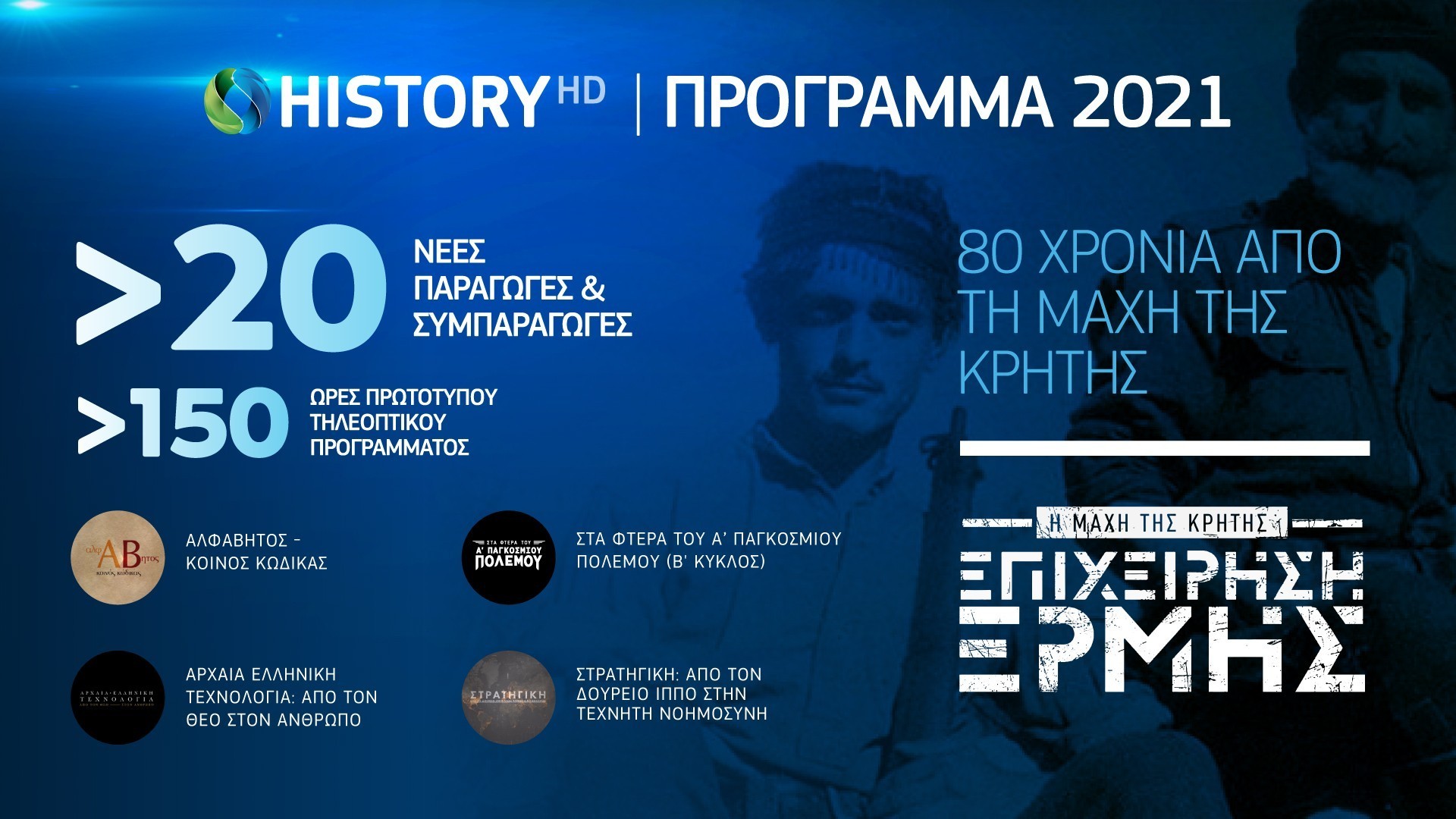 Μεταξύ άλλων, στο πρόγραμμα του COSMOTE HISTORY HD έρχονται οι σειρές ντοκιμαντέρ «Αλφάβητος – Κοινός κώδικας» για την πορεία του ελληνικού αλφαβήτου ανά τους αιώνες, «Η μάχη της Κρήτης: Επιχείρηση Ερμής», για τα 80 χρόνια από τη μάχη της Κρήτης και «Αρχαία ελληνική τεχνολογία: Από τον θεό στον άνθρωπο», με θέμα την επιρροή της ελληνικής αρχαιότητας στην σύγχρονη τεχνολογία, όλες σε παραγωγή COSMOTE TV.