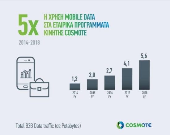 Την τελευταία πενταετία, η κίνηση δεδομένων στα προγράμματα κινητής για επαγγελματίες, μέσω του δικτύου κινητής της COSMOTE, έχει πενταπλασιαστεί, ενώ το 2018 η κίνηση των data των επιχειρησιακών συνδρομητών αναμένεται να φτάσει τα 5,6 petabyte.
