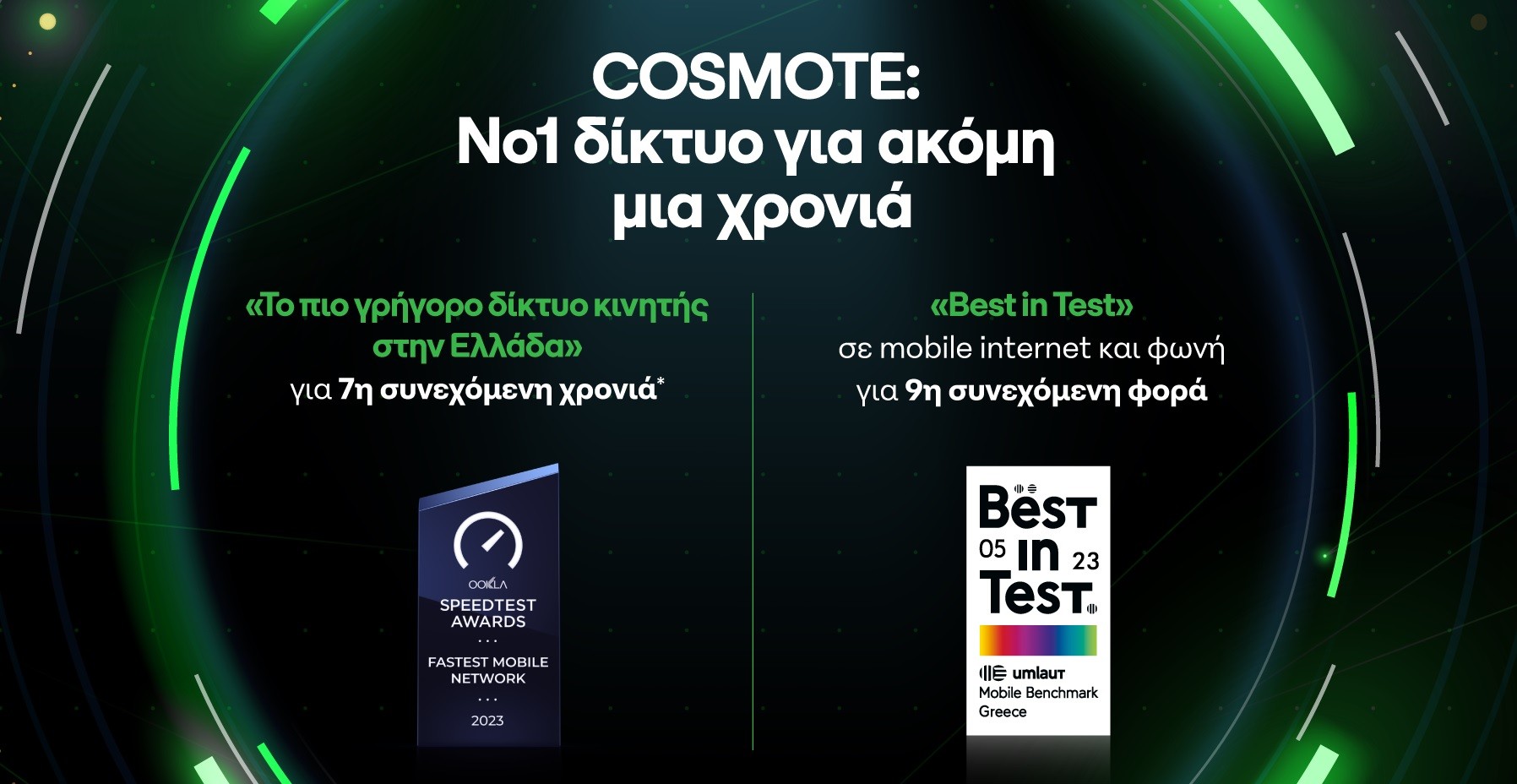 Δύο ακόμη σημαντικές διακρίσεις απέσπασε το προηγμένο δίκτυο κινητής της COSMOTE, που ξεχώρισε και φέτος για την ταχύτητα, την αξιοπιστία και την ποιότητα των υπηρεσιών του. Η COSMOTE ανακηρύχθηκε «το πιο γρήγορο δίκτυο κινητής στην Ελλάδα» για 7η συνεχόμενη χρονιά, σύμφωνα με το Speedtest® της Ookla®1, της πρώτης εταιρείας παγκοσμίως για μετρήσεις mobile internet. Παράλληλα, έλαβε την πιστοποίηση «Best in Test» για 9η συνεχόμενη φορά για τις υπηρεσίες mobile internet και φωνής, από την διεθνώς αναγνωρισμένη εταιρεία μετρήσεων τηλεπικοινωνιακών δικτύων, umlaut, πλέον τμήμα της Accenture.