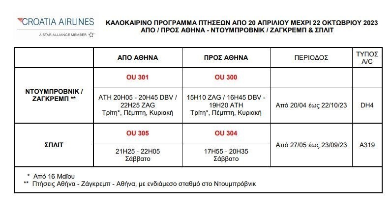 Συγκεκριμένα, από τις 20 Απριλίου μέχρι τις 22 Οκτωβρίου 2023, θα συνδέει την Αθήνα με το Ντουμπρόβνικ και το Ζάγκρεμπ τρεις φορές την εβδομάδα, κάθε Τρίτη, Πέμπτη και Κυριακή και από τις 27 Μαϊου μέχρι τις 23 Σεπτεμβρίου 2023, θα αναχωρεί απευθείας πτήση από την Αθήνα για το Σπλιτ, κάθε Σάββατο.