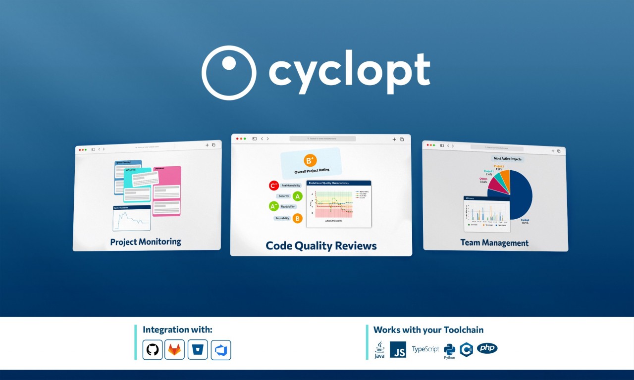 Με μότο «για να βελτιώσεις κάτι πρέπει πρώτα να μπορείς να το μετρήσεις» η ομάδα της Cyclopt, απευθύνεται σε όλες τις επιχειρήσεις που εμπλέκονται είτε άμεσα είτε έμμεσα στο πεδίο της ανάπτυξης λογισμικού, προσφέροντάς τους μια διαδικτυακή πλατφόρμα που προσφέρει ένα 360ο view για την βέλτιστη παρακολούθηση και διαχείριση του παραγόμενου κώδικα.